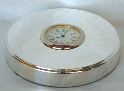 Reloj de mesa en metal plateado. BD Orfebres. Diámetro: 9 cm.