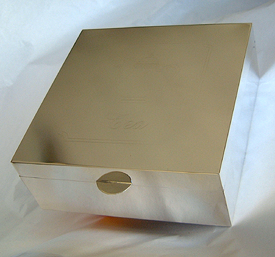 Caja para té, interior en madera primera calidad con cuatro divisiones para saquitos de té y exterior en metal plateado. Size: 17 cm.* 17 cm. * 7 cm. BD Orfebres.