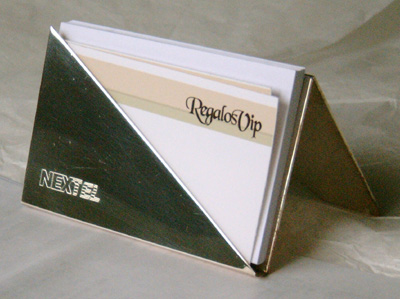 Tarjetero sobre de escritorio, Solapa triangular. Metal Plateado. BD Orfebres. Medida: 10 cm. * 5 cm. Presentado en caja presentación de cartón exterior forrado en negro e interior forrado en papel blanco.